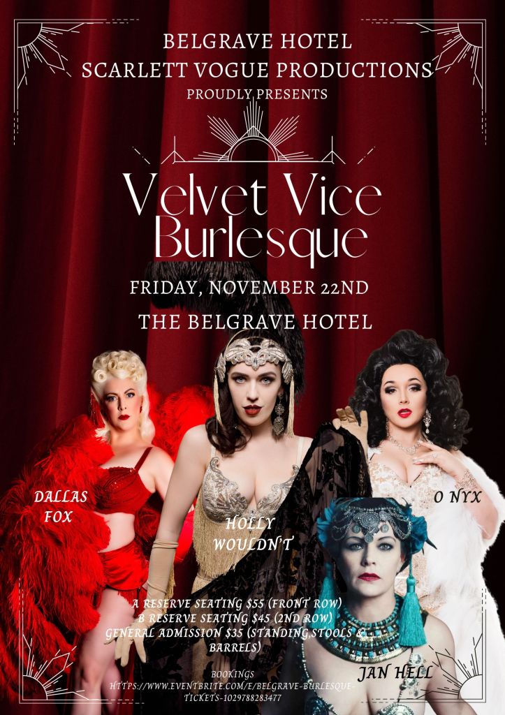 Scarlett Vogue Productions & The Belgrave Hotel Presents: Velvet Vice Burlesque Featuring: Dallas Fox, O Nyx, Miss Holly Wouldn’t, Jan Hell
